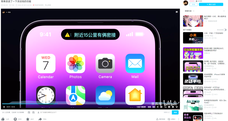 这种对于灵动岛功能的灵活应用不是 Smolka 的一家独创,在B站上也有用户提出自己的设计。B站UP主@羊真闲就在苹果发布会后不久,就提出了自己的设计,通过对灵动岛界面的改编,为手机加入诸如密接预警、排队人数显示、核酸指引之类的内容,增强灵动岛的实用性。