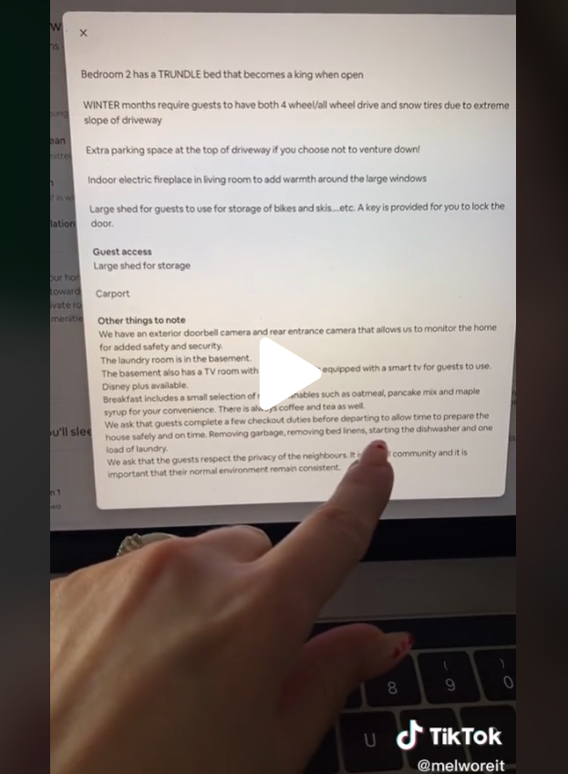 她把对 Airbnb 家务琐事列表的吐槽做成了一个小视频,发到了自己的 TikTok 上,很快就获得了几万个点赞和近5千条留言。视频的标题是:700刀两晚?还是要干家务哟 ($700 for two mights ≠ no chores lol)