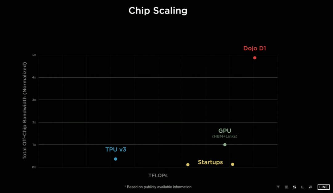 去年特斯拉宣称 Dojo 所采用的的 D1 处理器的片外带宽远高于谷歌 TPU 和其他科技公司的 GPU-based 分布式计算阵列。