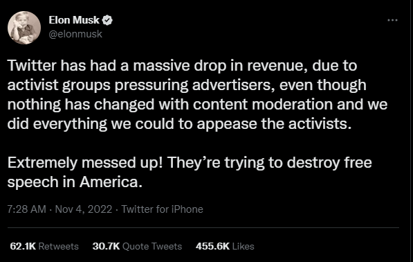 “由于激进团体向广告商施压,Twitter的收入大幅下降,尽管内容审核没有任何变化,我们也尽了一切努力来安抚激进分子。