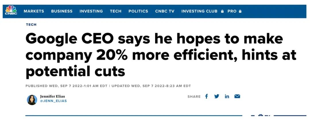 Meta目前的情况确实不太乐观,其的市值从2021年9月的超过1万亿美元已经下降到目前不足4000亿美元,社交家族的用户和营收增长出现明显乏力,元宇宙还在疯狂烧钱。削减成本对于Meta来说似乎势在必行,而最立竿见影的“降本”无疑是来自于削减员工。虽然Meta最近的讨论热度最高,但其他硅谷大厂的裁员和成本缩减计划实际上也正在进行中,并且力度也并不小。其中,过去一贯被认为是标志性养老大厂的谷歌最近就明显透露出了狼性气息。在上月中旬的谷歌Code Conference大会上,谷歌CEO Pichai公开表示面对经济不确定性加剧和广告收入的放缓,他希望将公司的效率提高20%。讲话中他提到了两个关键问题,一是在员工人数激增后,公司效率已经变得“更慢”;二是谷歌正在采取一些措施提高效率,列举了过去把 YouTube Music 和 Google Play Music 整合到一个产品中的例子,暗示着将进行部门整合。当时大家纷纷分析,Pichai提到的这个20%的数字并不是随口一说,在公开场合这样表述即表示谷歌内部已经进行了大量的调查和论证,最后层层确定了这个比例。紧随其后,谷歌裁员第一枪就打响了。九月中旬,谷歌内部的研发创新孵化器部门 Area 120宣布缩减规模,14个正在进行的研发项目被砍掉了7个。Area 120 是谷歌于2016年推出的一个创业型项目,主要是提供让员工能够测试新想法孵化新项目的平台。Area 120曾经孵化出了非常多的产品,比如HTML5游戏平台GameSnacks,视频平台Tangi和Shoploop,互联网旅游APP Touring Bird等,很多产品都被后续融入到了谷歌的主要产品体系中。此次砍掉的项目,除了去年年底推出的网络店面的服务产品Qaya 之外,还包括包括谷歌表格的财务会计项目、与购物相关的产品、AR/VR 分析气候等相关刚开始推进的项目。此次,Area 120约有一半的员工被波及,谷歌给了这些员工90天的时间让他们进行内部转组,如果无法找到职位,明年一月这些员工就将被解雇。从Area 120被砍可以看出,谷歌的部门整合似乎已经开始从低收益部门开始,很多人猜测谷歌The other bets中的部门之后将会成为被整合的重点。
