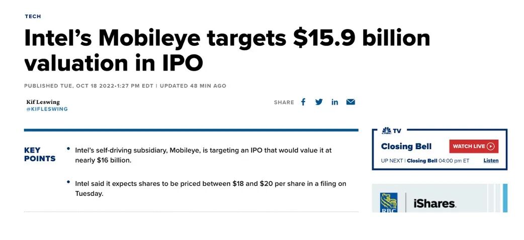 所以去年年末,英特尔宣布Mobileye上市计划时,市场曾给出了高达500亿美元以上的估值。但如今不到一年,由于当前科技IPO市场正面临近20年来最严重的低迷,让Mobileye的热度也随之大幅下降。