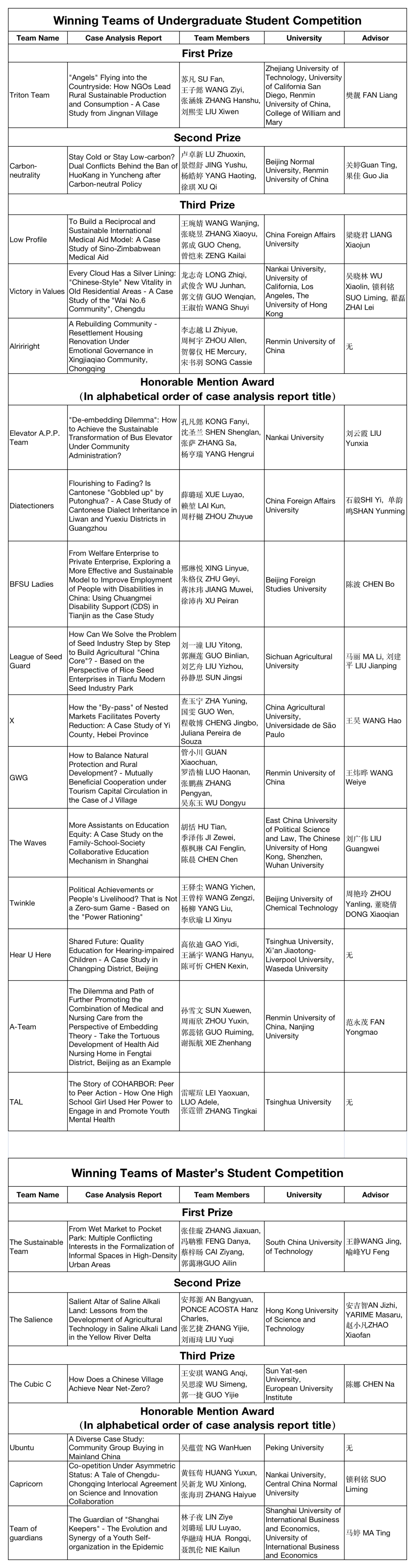 随后进入奖项公布环节,朱旭峰执行院长揭晓了本科生组获奖名单。一等奖获奖团队Triton Team由来自浙江工业大学、加利福尼亚大学圣迭戈分校、中国人民大学、威廉玛丽学院的苏凡、王子懿、张涵姝、刘熙雯组成,案例分析报告题目是《"Angels" Flying into the Countryside: How NGOs Lead Rural Sustainable Production and Consumption - A Case Study from Jingnan Village》。二等奖获奖团队Carbon-neutrality由来自北京师范大学、中国人民大学的卢卓新、景煜舒、杨皓婷、徐琪组成,案例分析报告题目是《Stay Cold or Stay Low-carbon? Dual Conflicts Behind the Ban of HuoKang in Yuncheng after Carbon-neutral Policy》。三等奖获奖团队有三支,分别是由来自外交学院的王琬婧、张晓昱、郭成、曾恺来组成的Low Profile团队,案例分析报告题目为《To Build a Reciprocal and Sustainable International Medical Aid Model: A Case Study of Sino-Zimbabwean Medical Aid》;来自南开大学、加利福尼亚大学洛杉矶分校、香港大学的龙志奇、武俊含、郭文倩、王淑怡组成的Victory in Values团队,案例分析报告题目为《Every Cloud Has a Silver Lining: "Chinese-Style" New Vitality in Old Residential Areas - A Case Study of the "Wai No.6 Community", Chengdu》;来自中国人民大学的李志越、周柯宇、贺馨仪、宋书羽组成的Alririright团队,案例分析报告题目为《A Rebuilding Community - Resettlement Housing Renovation Under Emotional Governance in Xingjiaqiao Community, Chongqing》。其它进入决赛的队伍均获得优秀奖。
