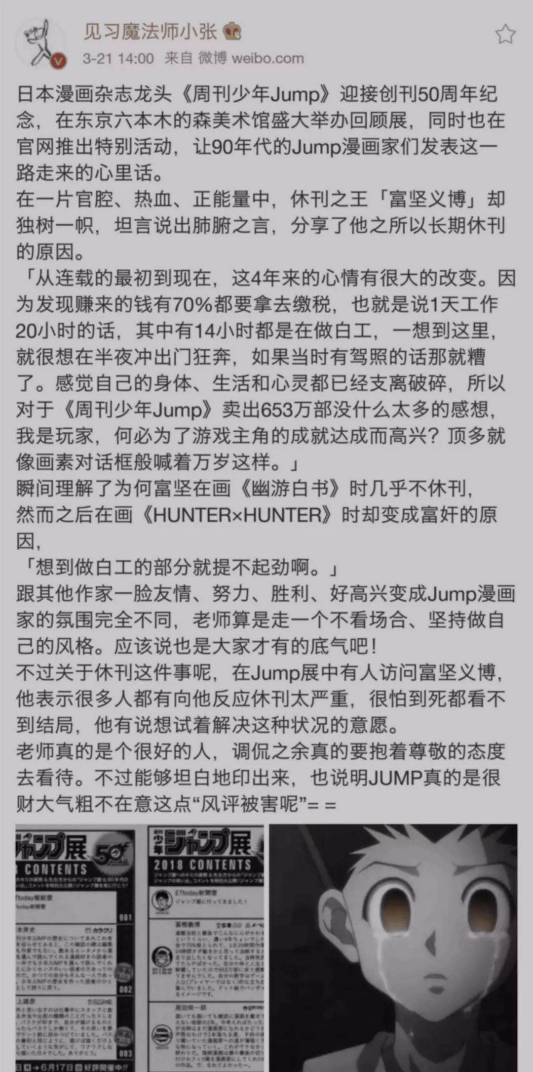 但在《周刊少年JUMP》的50周年庆时,富坚第一次说出了他频繁休刊的原因