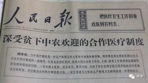 1968年12月5日,《人民日报》头版报道了湖北省宜昌地区长阳县乐园公社成功举办合作医疗的试点经验