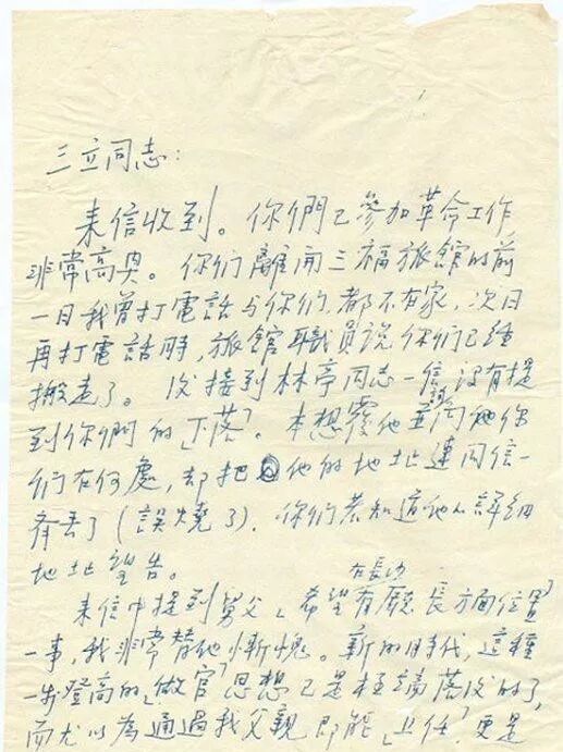 来信收到。你们已参加革命工作,非常高兴。你们离开三福旅馆的前一日我曾打电话与你们,都不在家,次日再打电话时,旅馆职员说你们已经搬走了。后接到林亭同志一信,没有提到你们的“下落”。本想复他并询问你们在何处,却把他的地址连同信一齐丢了(误烧了)。你们若知道他的详细地址望告。