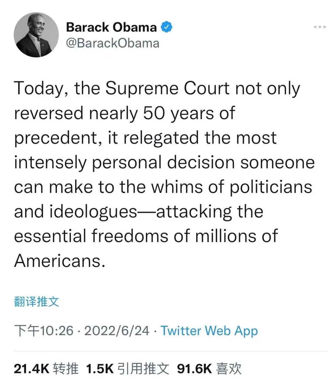 美国总统拜登称这是一个悲剧性的错误(a tragic error)。前总统奥巴马更是一针见血地指出:今天,最高法院不仅推翻了近50年的先例,还将一个人最私人的决定交给了政客和理论家的心血来潮,这侵犯了数百万美国人的基本自由。![]()