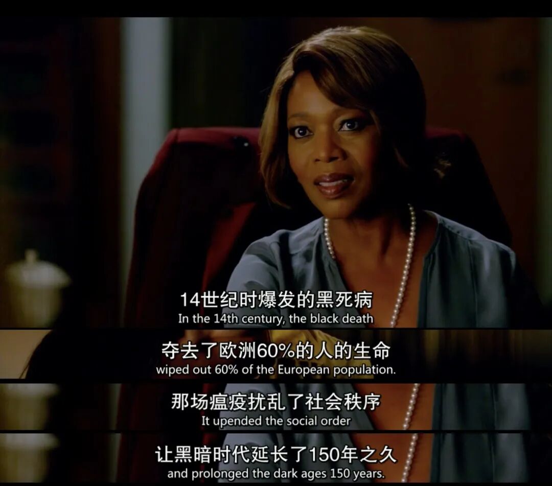 举个美剧里的例子: In the 14th century, the black death wiped out 60% of the European population. It upended the social order and prolonged the dark ages 150 years.