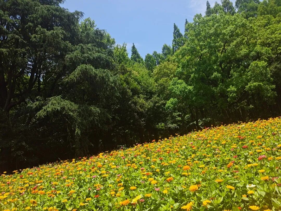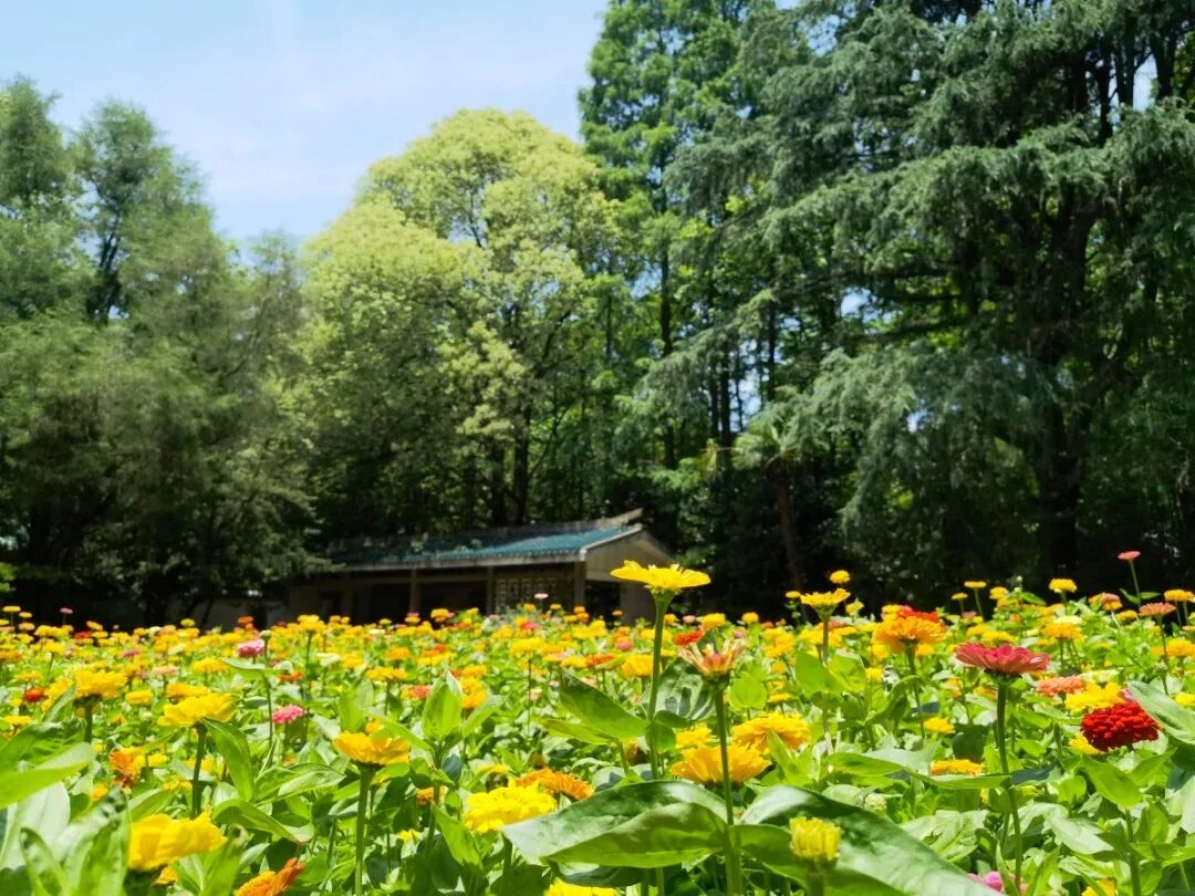 此次亭廊前草坪布置百日草花田,不仅花期很长,能陆续从六月开到九月,长期保持鲜艳的色彩,更象征友谊天长地久。