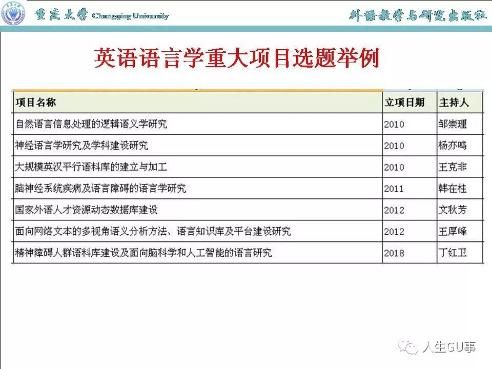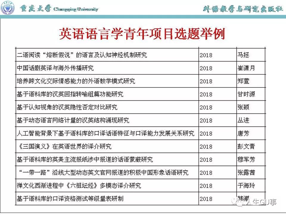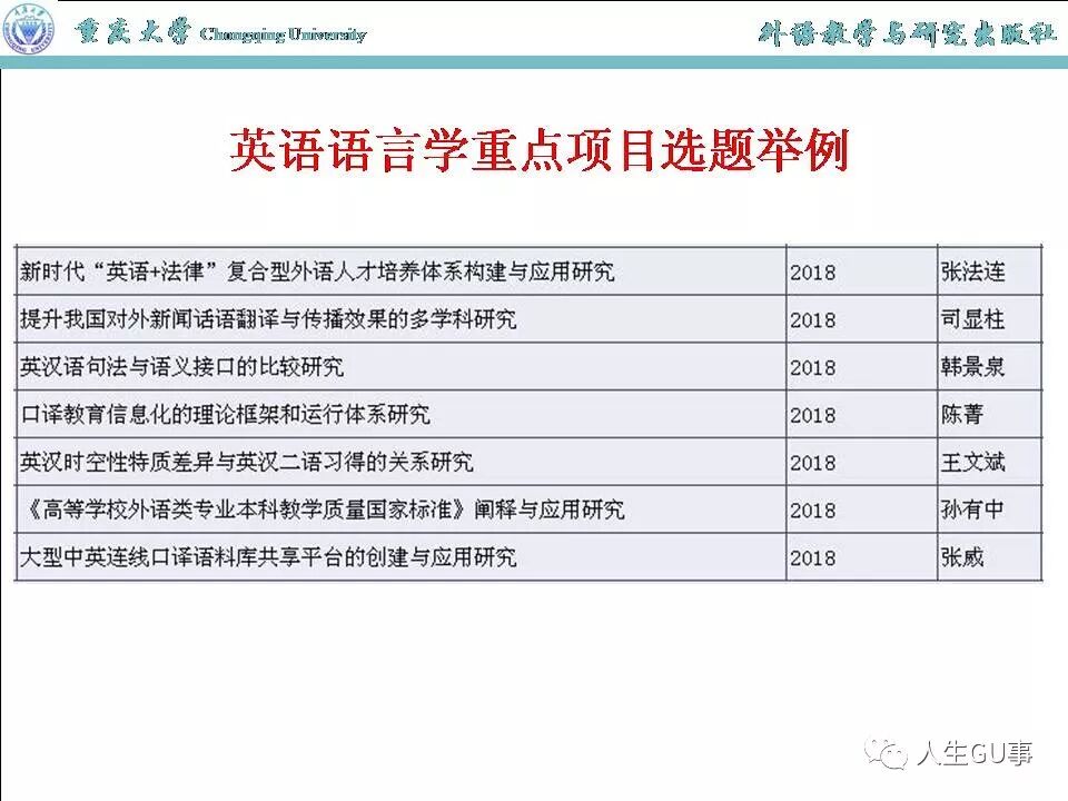 随附2018年12月8号外语教学与研究出版社科研项目设计与申报研究班讲座“国家社科基金历年立项课题分析——以英语语言学为例”的PPT,供参考。
