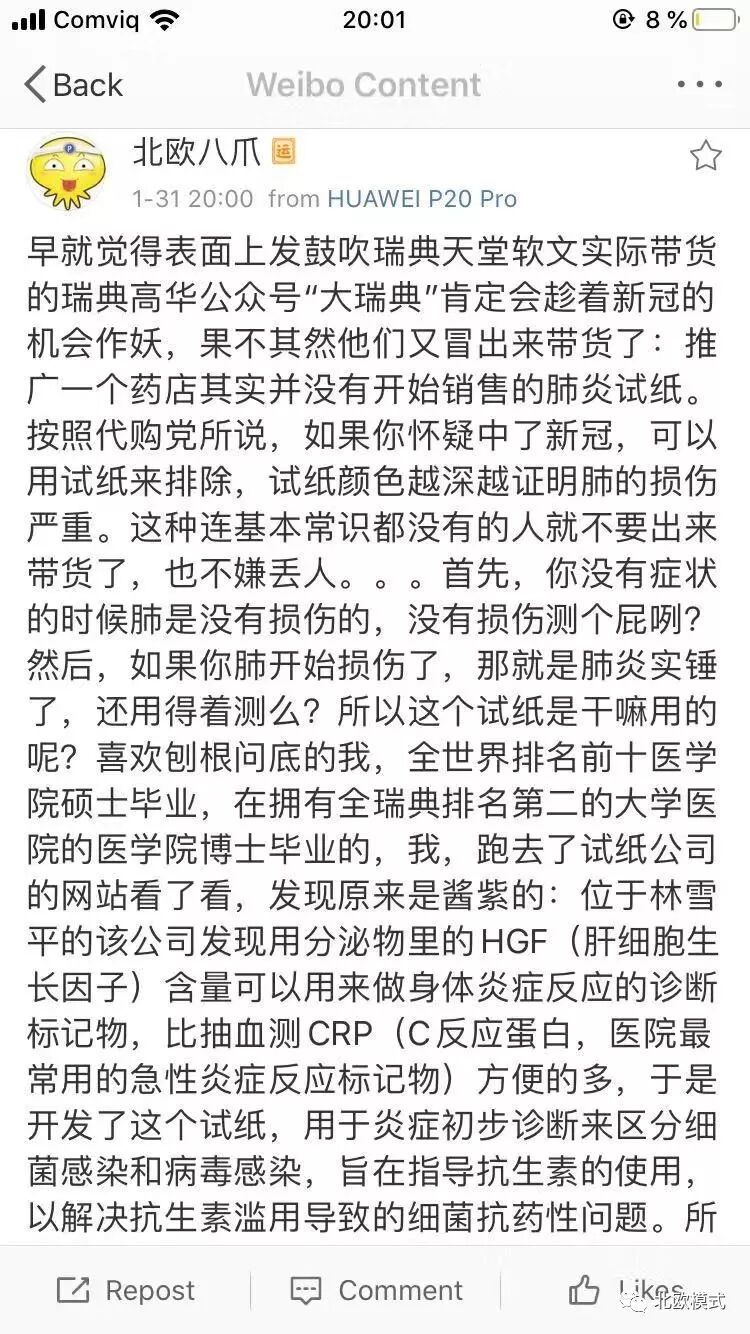 首先我之前的微博文章针对的是公众号“大瑞典”,他们发布明显虚假的广告带货,推广那个并没有在药店销售,而且本不适用于排查新冠肺炎的试纸,被我怼了。但是明显这波运作背后的始作俑者并不是公众号“大瑞典”,而是这个所谓的“专业的,深度的”公众号“K&W北欧咨询”,是他们在蹭武汉肺炎的热度在推广这个试纸,还搞什么饥饿营销,说试纸在瑞典限购,第一时间集中供应武汉,搞得好像有了这个试纸武汉同胞就有救了一样,但是实际上自己狗屁不懂,连试纸是干嘛用的都不知道,就急着赶紧想去带货了。