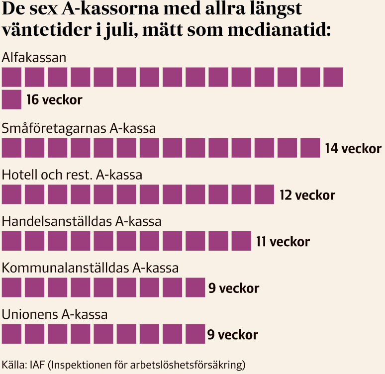 失业保险的监管机构发布的数据显示,瑞典的25个失业保险里面,目前平均申请处理时间最长的是Alfakassa,在6月份的时候平均等待时间是16个星期,即4个月,而Jessica所加入的Unionen的失业保险相对来说还好点儿,在6月份的时候平均等待时间是9个星期。