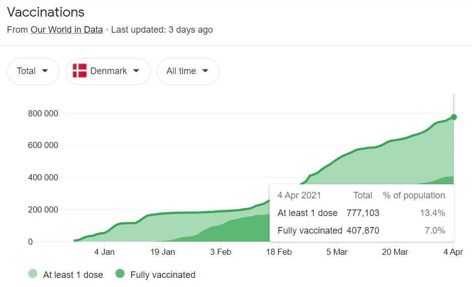 丹麦80岁以上的人口占总人口比例4.8%,70岁以上的占14.7%,60岁以上的占26.1%,50岁以上的占39.8%。目前有13.4%至少接种了一针疫苗,7%接种完2针疫苗,也就是说大概80岁以上的应该都2针接种完了,但70岁以上的应该还有不少第1针还没打上的。丹麦不同于瑞典而芬兰,至今停用阿斯利康疫苗,可能会对接种速度产生影响。