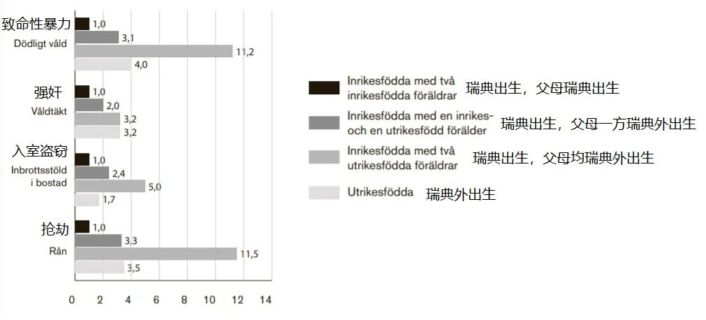 和瑞典出生且父母也都是瑞典出生的人相比,在瑞典出生且父母之一出生在瑞典之外的人成为犯罪嫌疑人的比例要高1.8倍,出生在瑞典之外的人成为犯罪嫌疑人的几率要高2.5倍,在瑞典出生且两个父母都出生在瑞典之外的人成为犯罪嫌疑人的几率要高出3.2倍。几率差别最大的是在致死性暴力(包括未遂)和抢劫方面,出生在瑞典且父母都出生在瑞典之外的人和出生在瑞典且父母也都出生在瑞典的人相比,成为犯罪嫌疑人的几率分别高出了11.2和11.5倍。