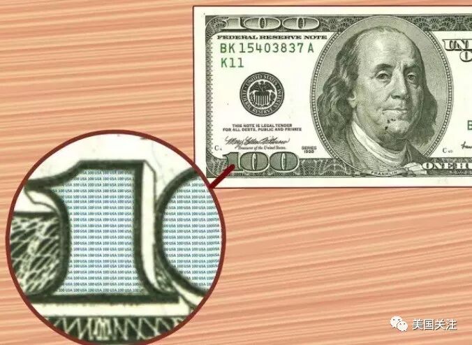7. 缩微印刷,仔细观察富兰克林的衣领、肖像下方边缘、水印边缘的金色羽毛笔 ,分别有如下的字句:"The United States of America" "USA"、"One Hundred USA"。水印蓝色边缘的正反面都有"USA100"的字句。