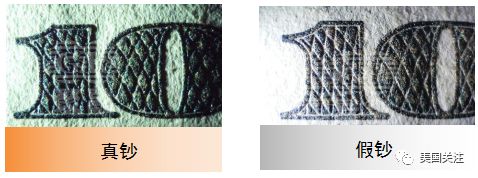 真钞运用雕刻凹版印刷。真的美钞凹印手感明显,尤其是全新的纸币。