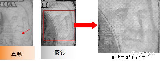 美元真钞的人像立体感强,活灵活现。而假钞上的人像则与背景融为一体。
