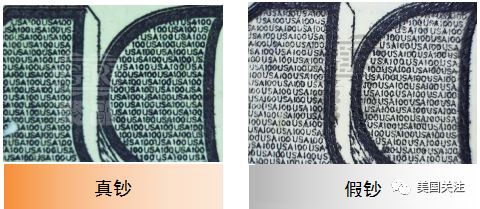 使用缩微印刷的假钞,缩微字体相对模糊,而真钞上的字体清晰可见。