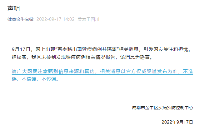 据央视新闻客户端报道,记者从重庆市第124场新冠肺炎疫情防控工作新闻发布会上获悉,9月16日,重庆市发现了1例境外输入猴痘病例,该病例系国外中转重庆入境的外省人员。目前所有密切接触者均已开展猴痘核酸检测,结果均为阴性。经国家和市级专家研判,该病例入境重庆即被集中隔离,无社会面活动轨迹,疫情传播风险低。