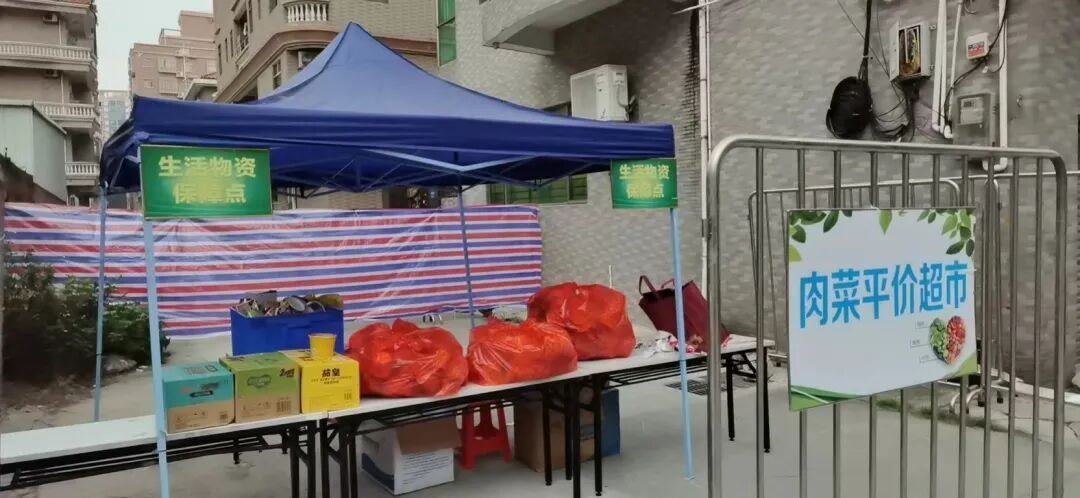 在厚街社区临时管控区,镇生活物资保障小组设立了一个肉菜平价超市、两个外卖生活物资保障点。