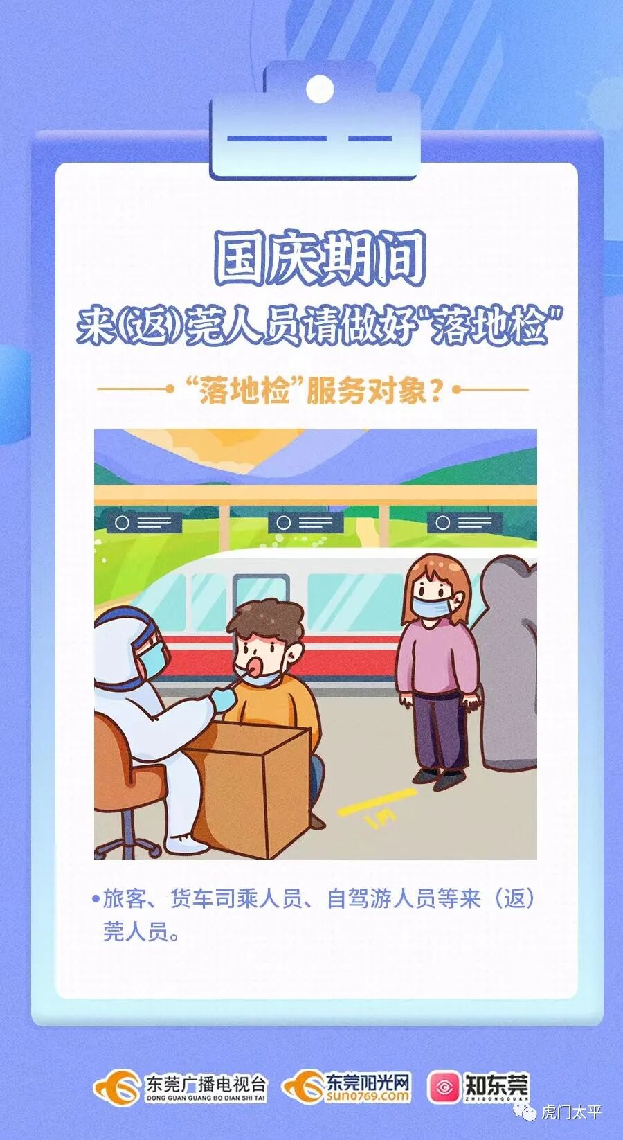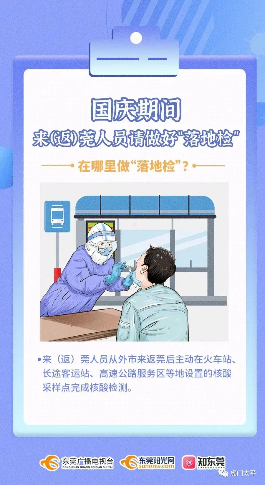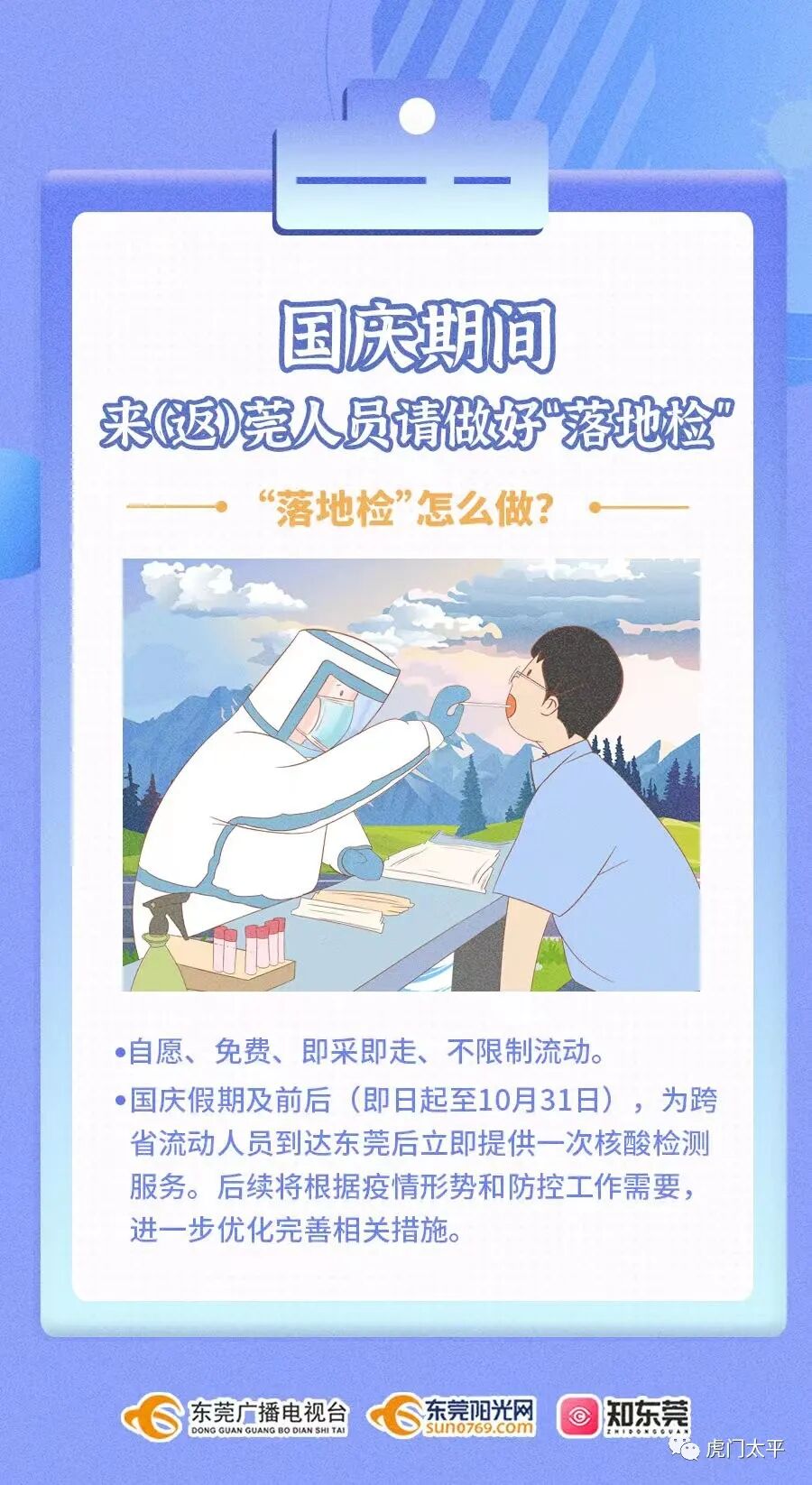 推广“落地检”,按照“自愿、免费、即采即走、不限制流动”的原则,跨省流动人员抵达目的地后,积极配合当地完成“落地检”。