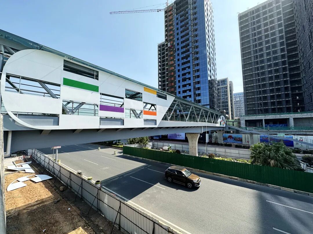 据了解,湖景大道人行天桥总长度62米,单幅跨度28米,高度5.5米,南、北侧各设置上下梯道衔接,桥梁面积约763.2平方米。此外,天桥北侧还预留有安装电梯位置,通过乘坐电梯可直达旁边的海怡广场。