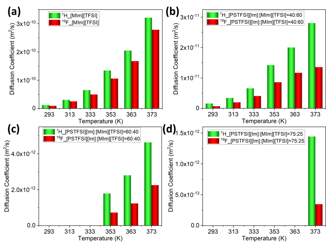 图2.离子液体和复合材料中1H和19F在不同温度下的扩散系数。
