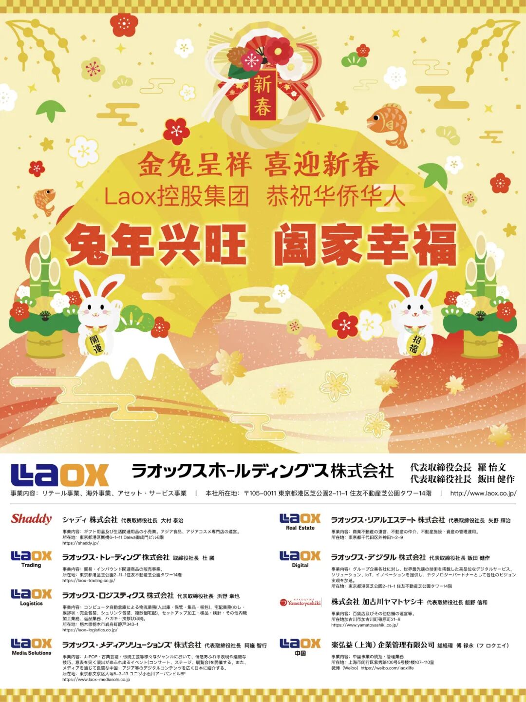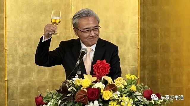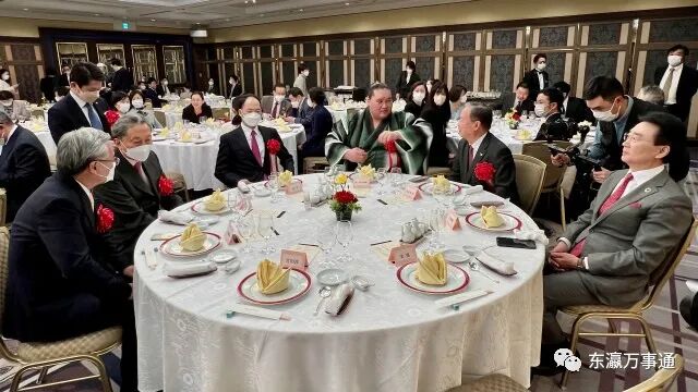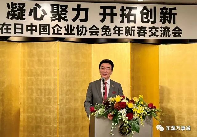 在日中企协会长王家驯代表主办方致辞,感谢大家的参与支持,祝福与会企业代表和家属们新春快乐,兔年吉祥。日本前首相鸠山由纪夫、中国驻日大使馆公使杨宇、日本大相扑横纲照ノ富士等中日嘉宾到会,并致辞祝贺。驻日大使馆商务公使宋耀明致祝酒辞。
