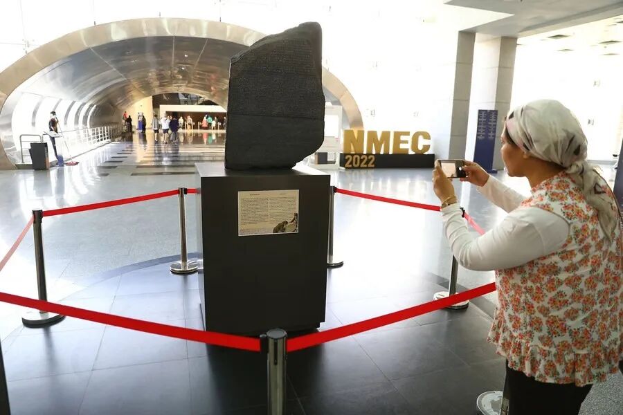 2022 年 9 月 20 日,一位游客在埃及开罗的埃及文明国家博物馆为罗塞塔石碑的复制品前拍照。考古学家、前埃及古物部长扎希·哈瓦斯(Zahi Hawass)呼吁大英博物馆归还罗塞塔石碑(Egyptians want Britain to return the Rosetta Stone)。他说:“它的家应该是埃及,而不是英国。” (图片来源:新华社/艾哈迈德·戈马)