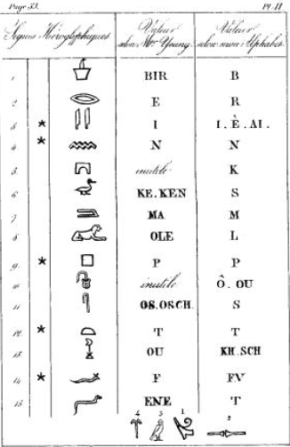 商博良的象形文字语音字符及其对应的通俗体文字和科普特语对照表(1822)