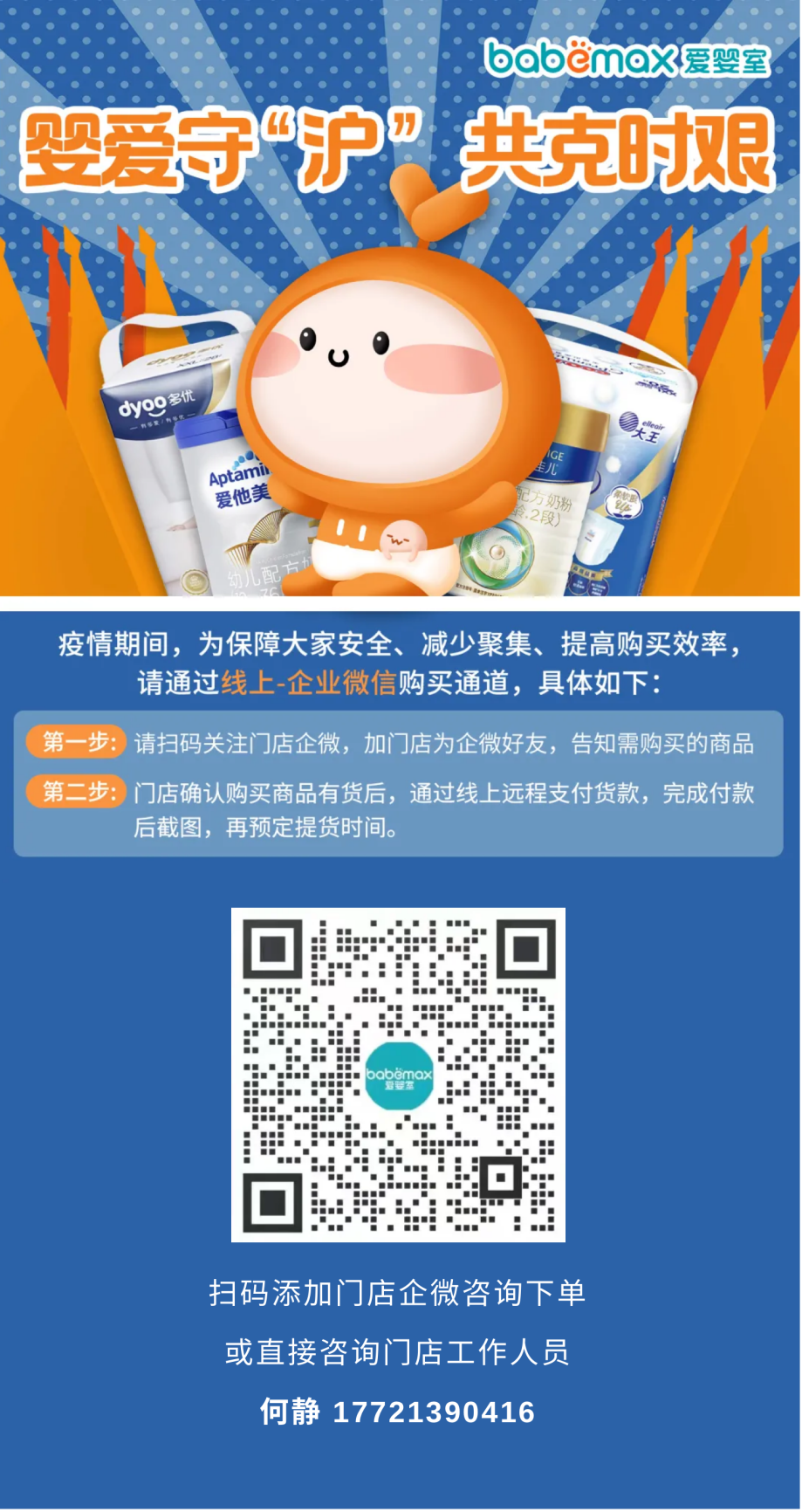 由于疫情防控要求,门店已开通企微线上接单服务。需要购买物资的宝爸宝妈们可添加门店企业微信咨询下单,门店工作人员将按顺序第一时间响应您的需求。