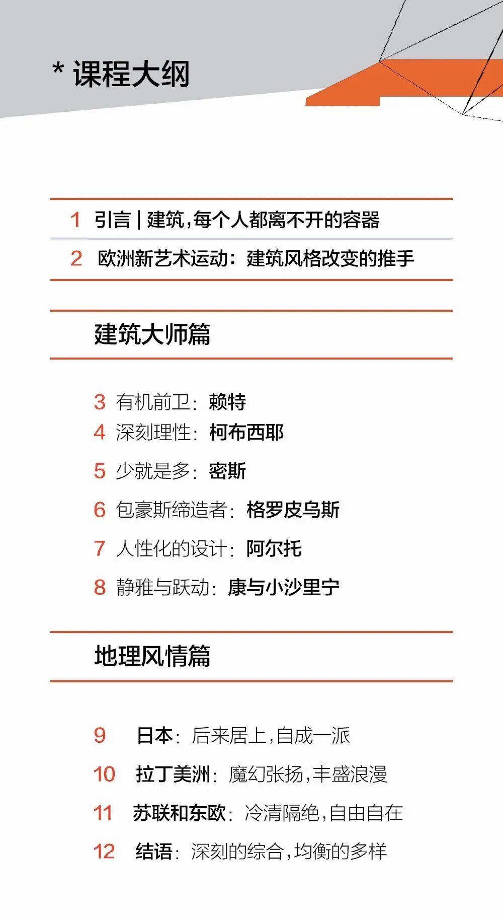 在课程中你将听到除高迪之外另外7位现代建筑大师的精彩故事,还将走遍世界,看完美国、德国、苏联、东欧、日本等世界各地的经典建筑,发现20世纪建筑对于今天依旧流行的玻璃房子、粗野主义、工厂风格的深刻影响。