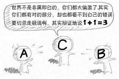 虽然大多数时候,真理确实存在于两种极端的中间地带,但是你不能轻易的认为只要是处于中间立场的观点就一定是正确的——谎言和实话的中间地带依然是谎言。
