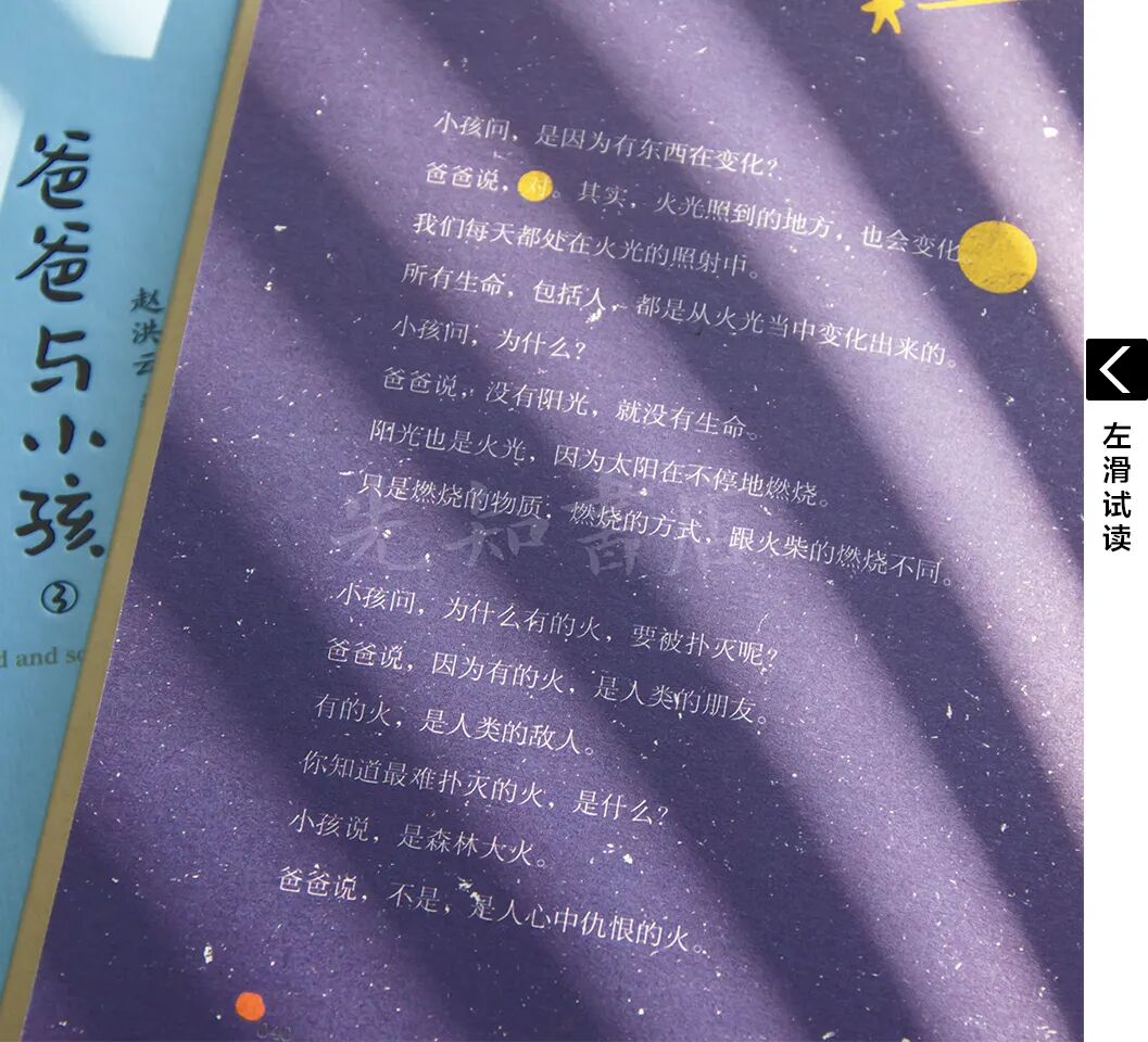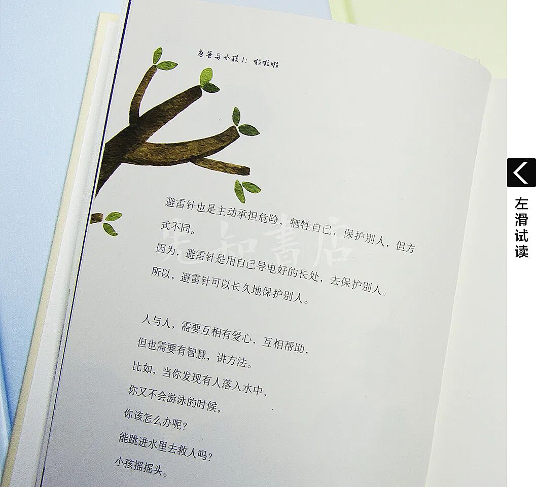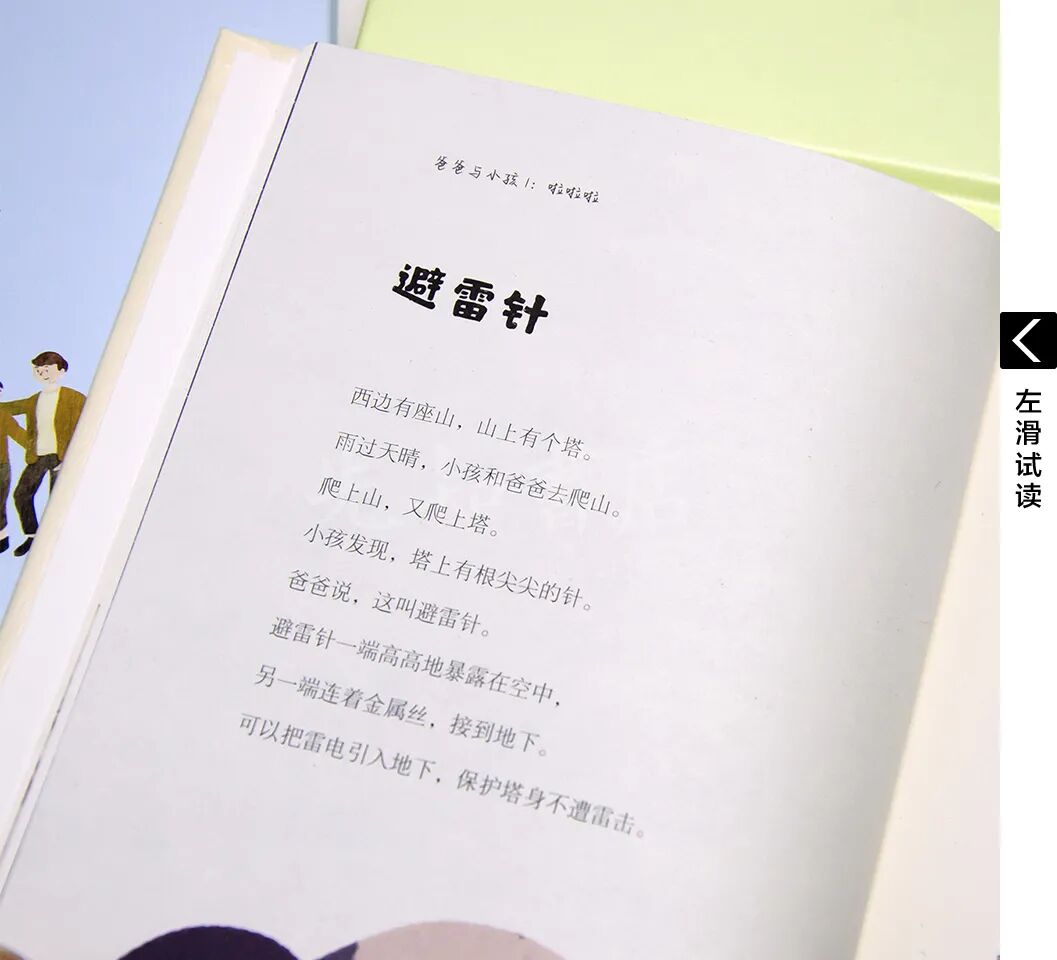 爸爸说,保险丝是用自己的弱点,保护别人。所以,它只能保护一次,自己的生命就结束了。避雷针也是主动承担危险,牺牲自己,保护别人,但方式不同。因为,避雷针是用自己导电好的长处,去保护别人。所以,避雷针可以长久地保护别人。这样的场景,很多父母都经历过,这样的问题,每个孩子小时候也都问过。但这样的回答,还是第一次从这套书中看到。翻遍《爸爸与小孩》三本书,几乎都是在这样真实的场景下,孩子一次次好奇的问,爸爸一次次在告诉孩子自然世界奥秘的同时,为孩子开启了一场充满人文精神的哲思之旅。