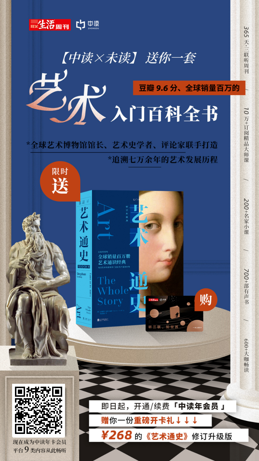 中央美术学院的李建群教授,在中读开设的专栏《看懂艺术,从学习艺术史开始》(价值199元);巫鸿、李军、张敢等13位资深学者主讲人,鉴赏13座顶级博物馆的100件珍宝的精品课《博物馆观看之道》(价值199元)……