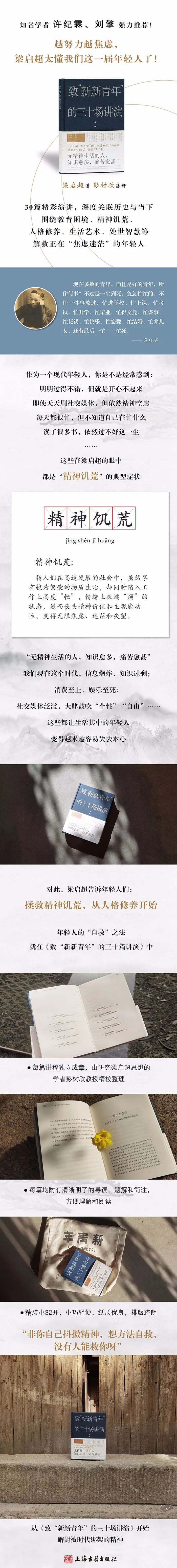 纵览任公这三十篇演讲,大多是围绕着读书与做人两个主旨展开的,凝结着他一生九死未悔的思索。任公最后对这一批1920年代的新青年谆谆告诫和期许道:“你无论在什么地方,总是社会的一分子,你也尽一分子的力,我也尽一分子的力,力就大了。将来无论在政治上,或教育上,或文化上,或社会事业上……乃至其他一切方面,你都可以建设你预期的新事业,造成你理想的新风气,不见得我们的中国就此沉沦下去的。”