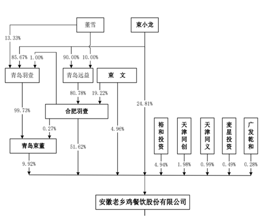 根据招股书,IPO前,束从轩之子束小龙和女儿束文通过直接持股的方式分别持有老乡鸡24.81%和4.96%的股份,此外,兄妹二人还通过青岛束董、合肥羽壹间接持有公司股权。而束小龙之妻董雪也通过间接持股持有公司股权,三人合计持有公司91.32%的股份。