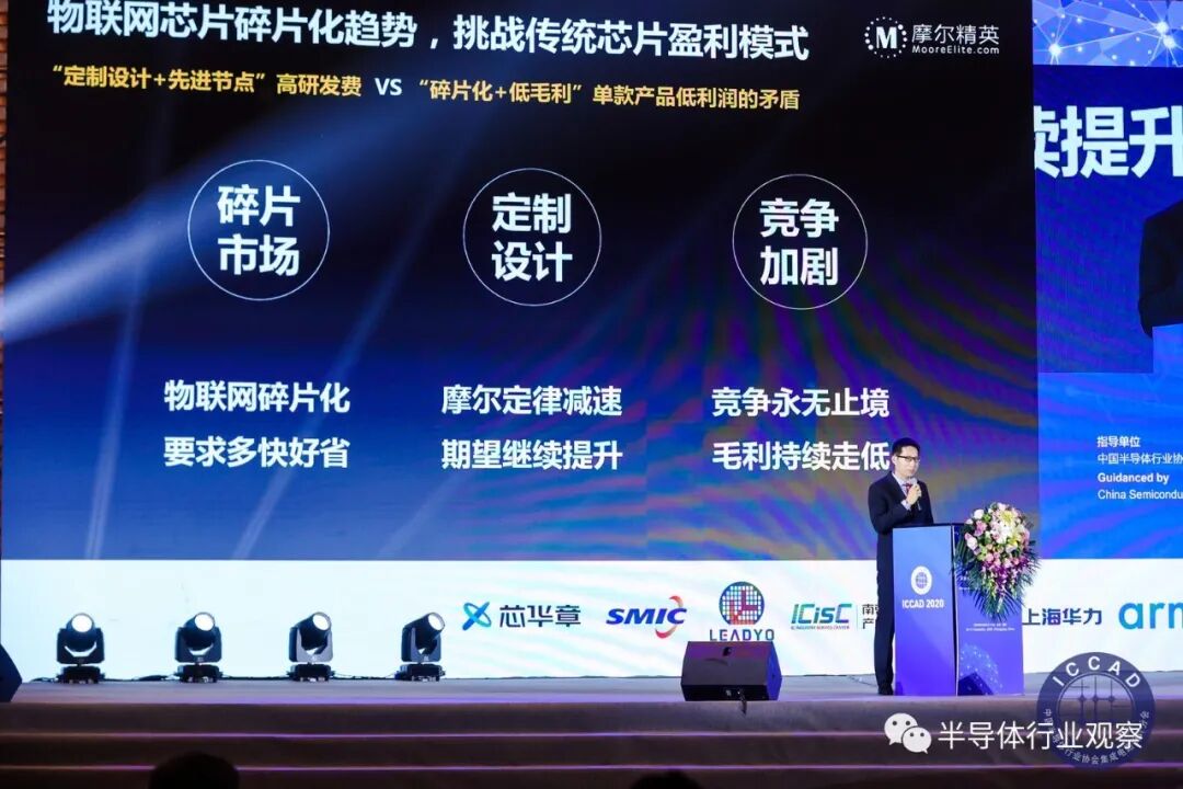 在12月10日于重庆举办的中国集成电路设计业2020年会(ICCAD 2020)高峰论坛上,摩尔精英董事长兼CEO张竞扬发表了“服务中国芯创业者的探索”的专题演讲。以下根据现场演讲整理:“压力山大”是2020年挥之不去的一个词,华为事件,技术封锁,中美博弈,把芯片行业送上了风口浪尖。大量的团队开始创业,各行各业都跨界做芯片。如何服务好这些满怀激情的中国芯创业者,是我和摩尔精英一直在努力和探索的方向。为什么芯片如此火爆?我认为最主要的原因是物联网市场变得成熟。未来的十年,联网的设备数量会增长20倍,新增高达7万亿美金的市场。这些智能联网设备的背后是大量的芯片机会。今天全球的芯片产值4500亿美金,只占全球GDP的不到0.6%;随着物联网设备在全球的铺开,这个比例会大幅提升,这是属于所有半导体人的机会。中国的芯片公司就更幸运了,近水楼台先得月,物联网一定只有在中国先发生了,才可能在世界各地发生,为什么这么说?因为中国是最大的制造业集群,最大的消费市场,有最强烈的智能升级需求,同时我们又有最高密度的城市,最好的基础设施,最快的经济发展速度,最完善的5G网络,最关键的是,我们还有全球接近一半的应届毕业生,丰富的工程师资源。有了这些基础,物联网的应用和普及才有机会,通过中国市场验证和完善的物联网产品会随着“一带一路”和中国制造走向世界。