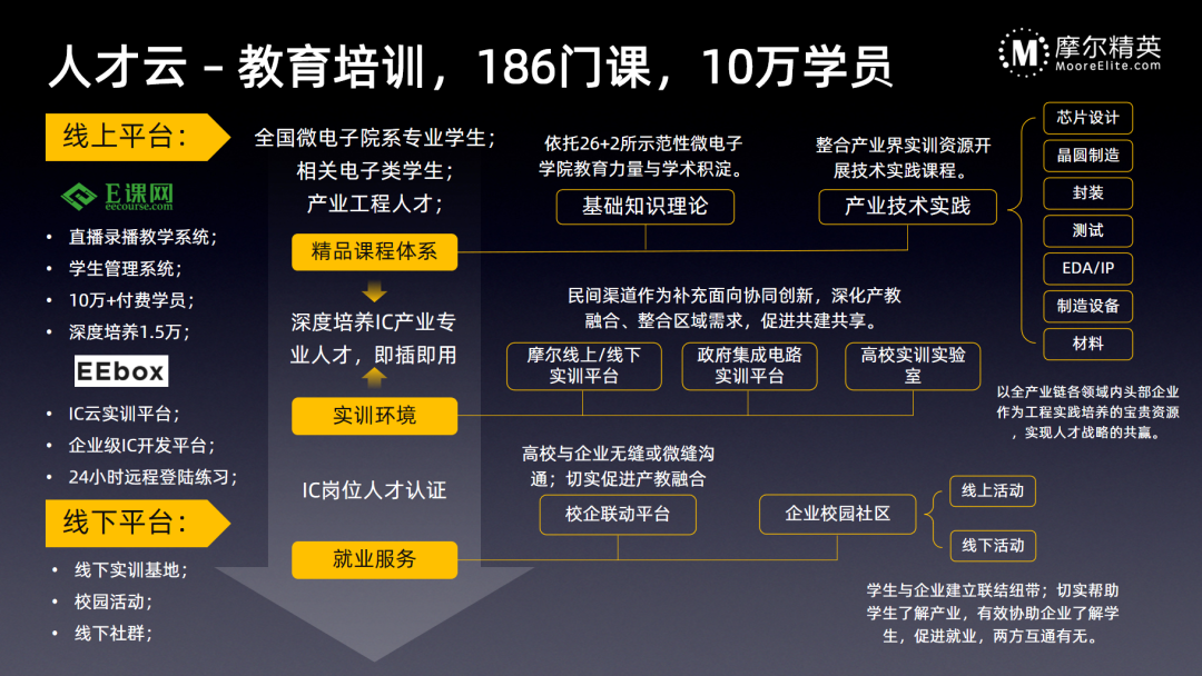 不同于传统的芯片设计服务和流片封测那样泾渭分明的流水线交接棒,摩尔精英的一站式解决方案无缝打通从芯片项目启动、设计、流片、封装、测试和量产的全链条,以芯片公司需求为中心,用解决方案整合供应商资源,为客户提供省心的一站式解决方案。我们将芯片设计和供应链的流程,划分成客户核心Know-how,双方协作和摩尔精英的技术方案矩阵,让客户可以最大化专注在芯片的核心架构和设计上,摩尔精英协同客户完成DFT与后端实现,封装、测试、可靠性的方案,助力客户完成量产前NPI所有工程环节,让产品能够快速、高质的进入量产,并在上量后持续的维护与监控。13.人才云 – 教育培训,186门课,10万学员