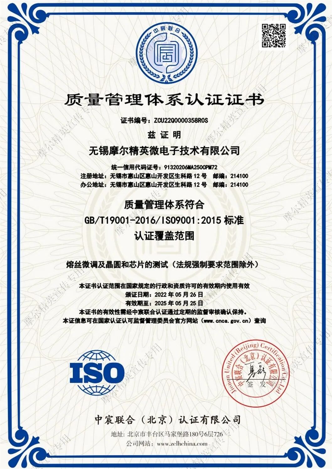 近日,摩尔精英无锡SiP先进封测中心-测试服务,通过了ISO9001:2015 标准认证。认证覆盖范围包括:熔丝微调及晶圆和芯片的测试。