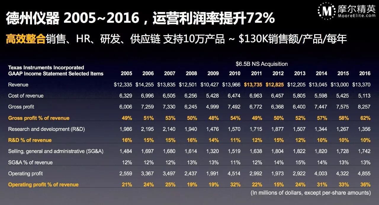 前面提到,诺基亚下跌给TI挖的30多亿美金的坑,TI怎么爬出来的?答案是收购,2011年,德州仪器以65亿美金“天价”(溢价70%)收购美国国家半导体,NS当时的营收在16亿美金往上, 即使加上NS,2012 TI整体营收还是掉了9亿美金;这次的教训也更加坚定了TI的“模拟小客户”战略。