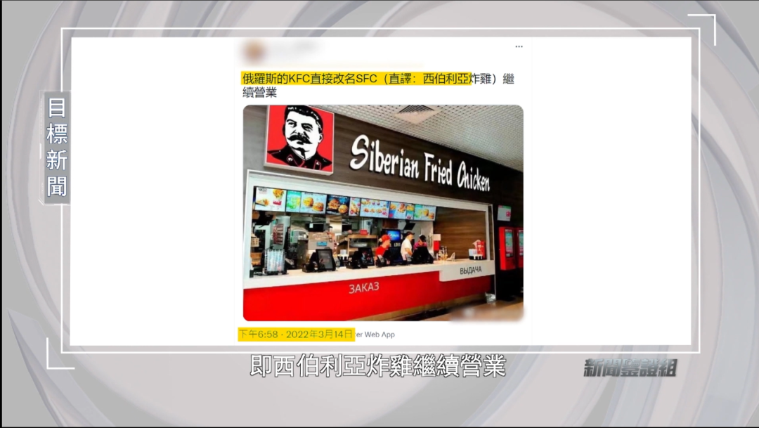 2022年3月14日,社交媒体上出现了一则贴文称,“俄罗斯的KFC直接改名SFC即西伯利亚炸鸡,继续营业“。