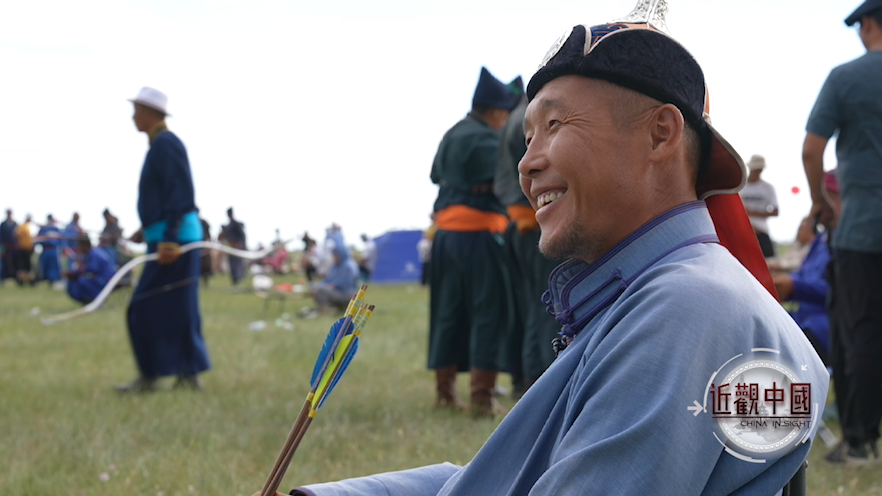 在这里我遇见一位射箭高手斯乐苏荣,他给我介绍了巴尔虎通克——这个像蛋糕一样的箭靶,还有射箭的规则。我还惊讶地了解到,他是非物质文化遗产巴尔虎传统角弓制作技艺传承人。我觉得很有趣,想和他继续聊聊。