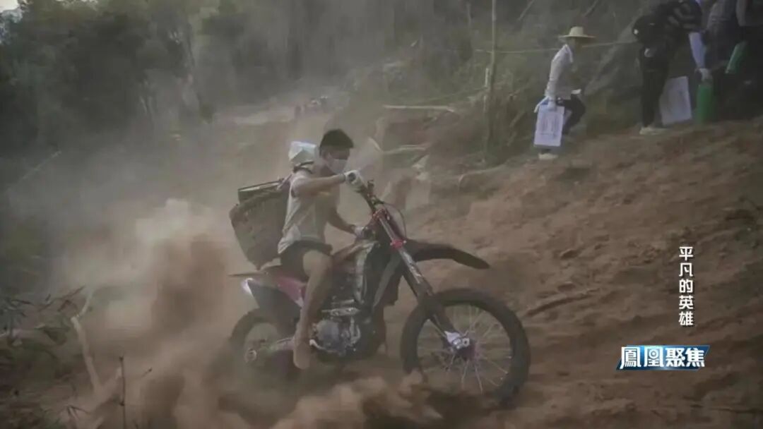 摩托车志愿者每人都有个竹背篓用来放物资,水、药品、热腾腾的饭菜,都是他们一趟趟这样背上去的,山路颠簸,要保证物资完整,速度也要快。