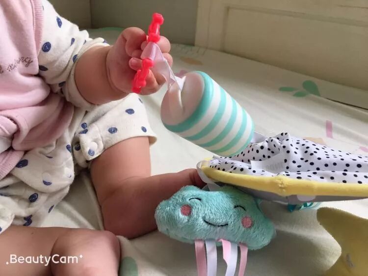 如果说一般的床铃,是停留在望与听的阶段。这个星空挂饰,对我们有点突破,蘑菇是布的、可以平放(顶部的勾会藏到里面,不会打到宝宝),牙胶的尺寸是外圈直径5厘米,方便宝宝抓握、加上声音悦耳,第一次看到妹妹小手抓一个东西抓得如此精细,如量“手”定做。