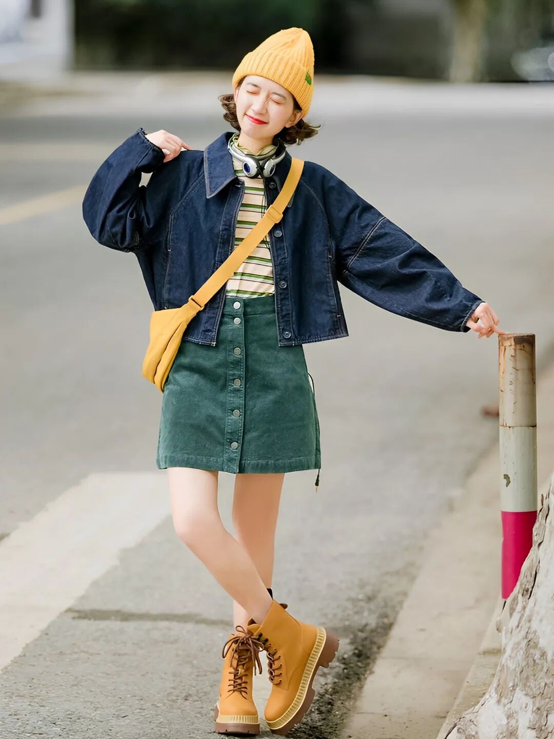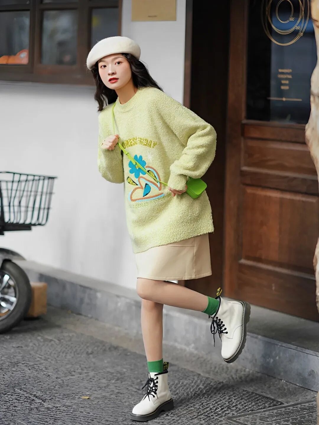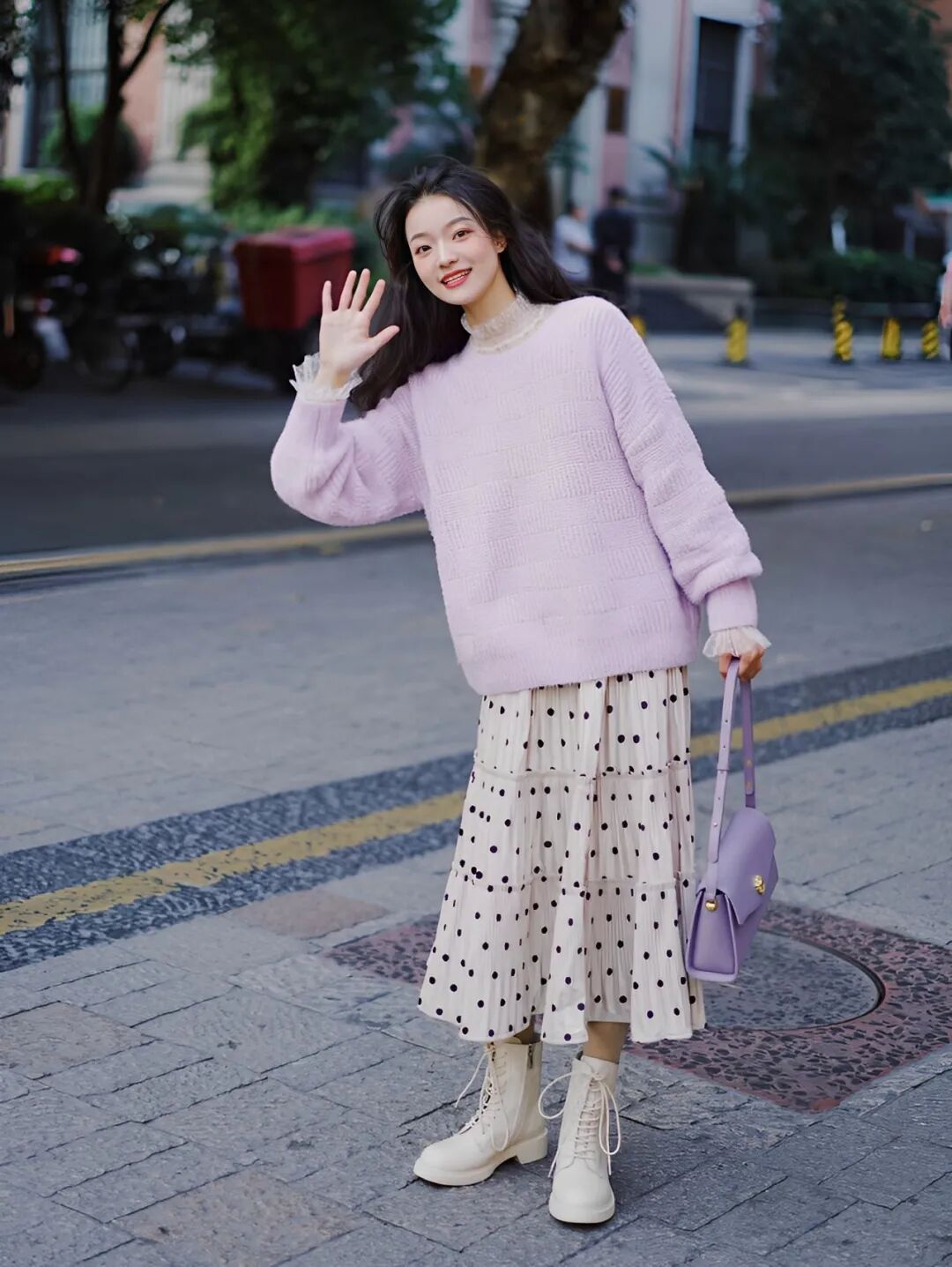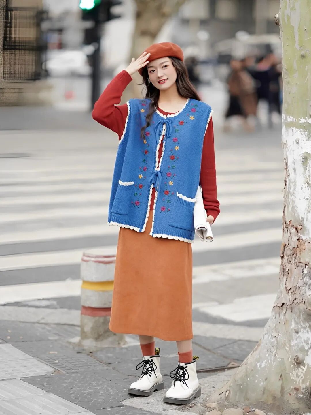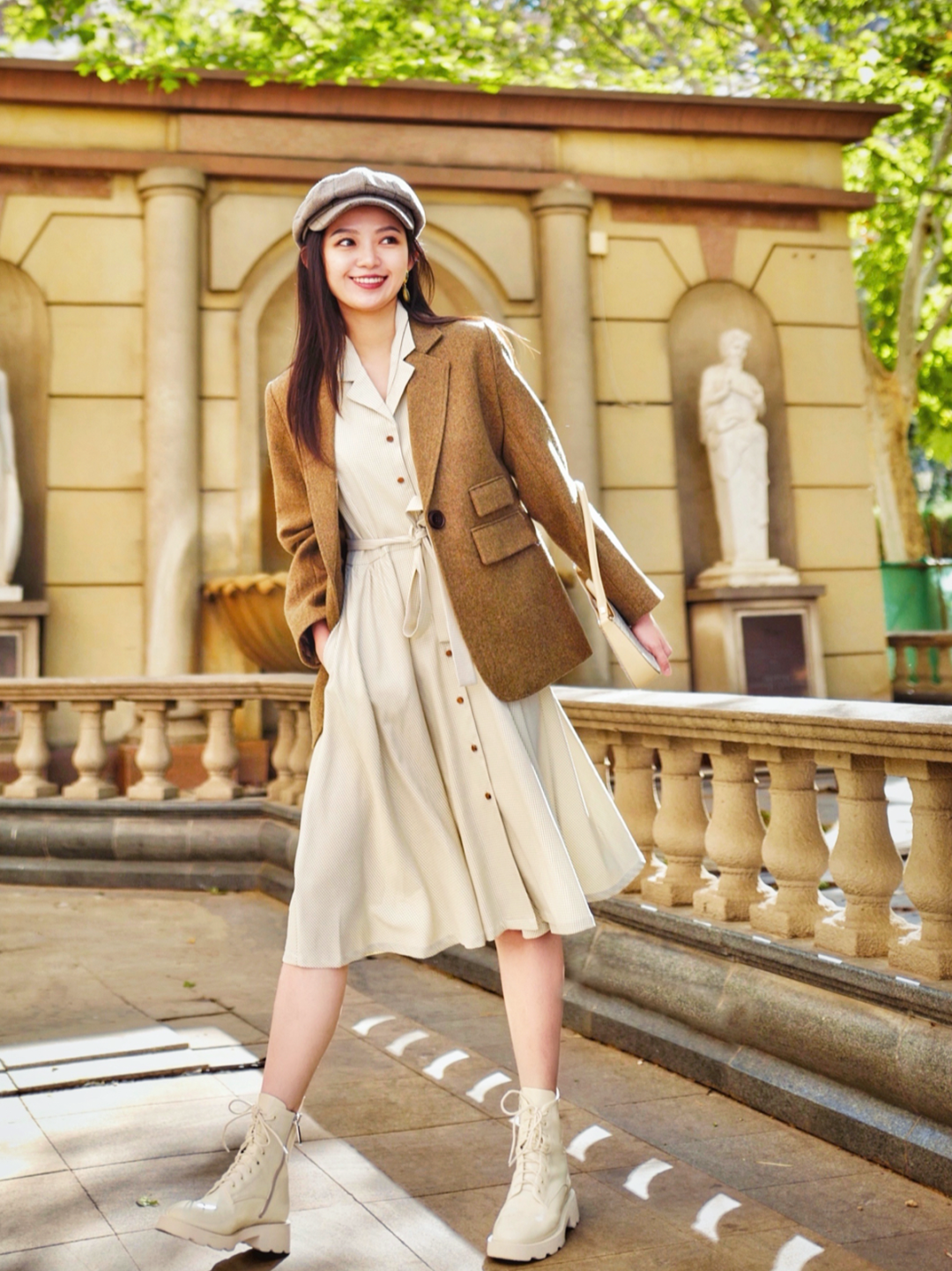 长裙+马丁靴同样适合日常出街,适合腿型没有那么完美的小个子~选择高于筒靴3-8cm的长裙,稍微露出一点肌肤,视觉上更显清爽。