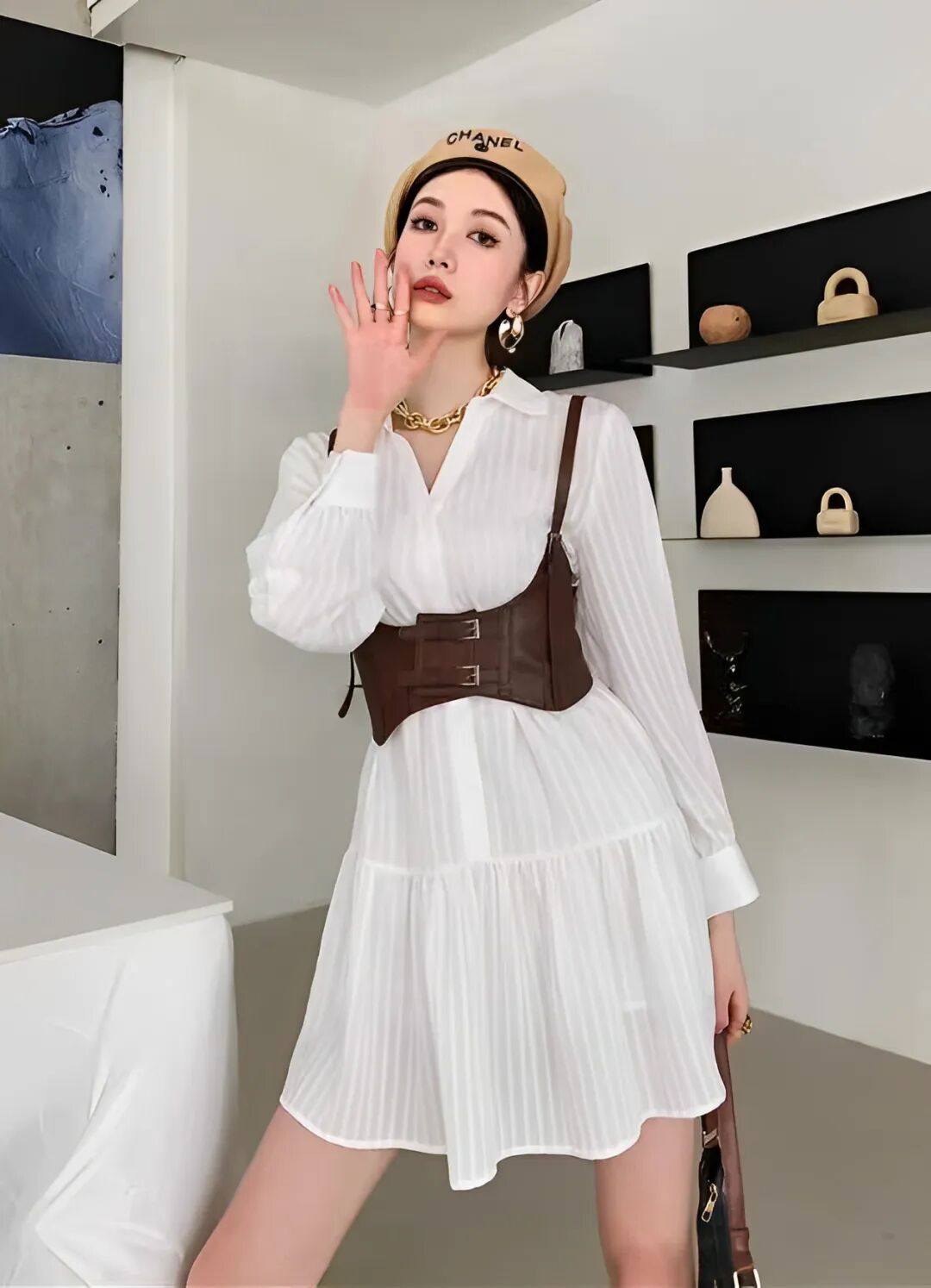 有些姐妹可能已经入手了直筒衬衫裙,那也没关系,只要系上一条皮带,就完美解决显胖问题喇~