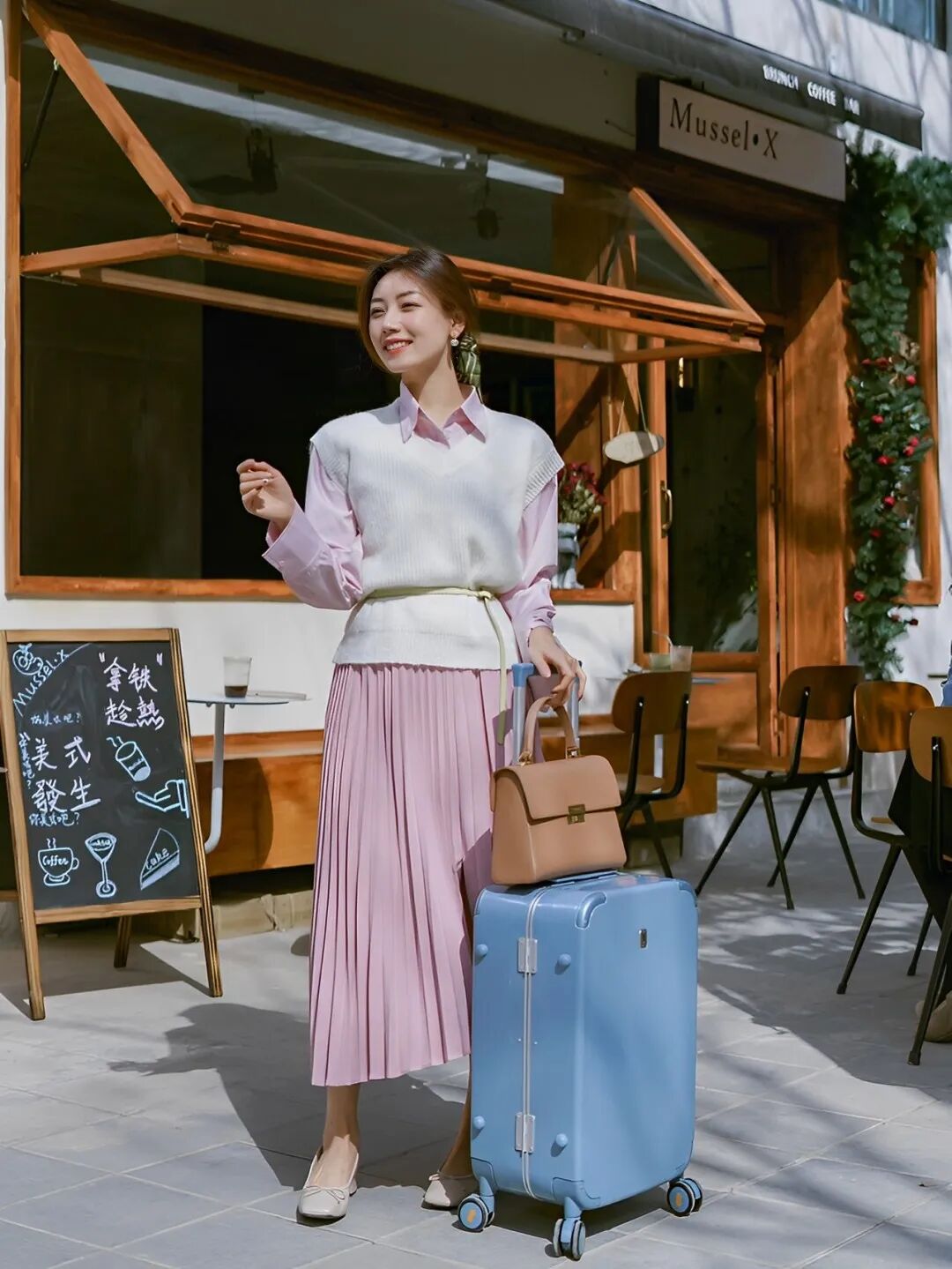 比如这种学院风的套装裙,内搭小面积的格纹马甲,就能get到英伦风。而且比起大面积的格纹,更不容易出错。