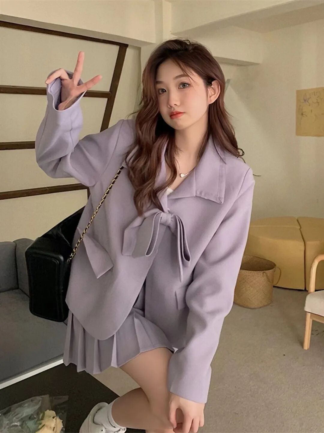 还有这种带了小蝴蝶结装饰的款,能削弱套装的正式感,害怕小西装显老气的姐妹,这类款式是不错的选择~