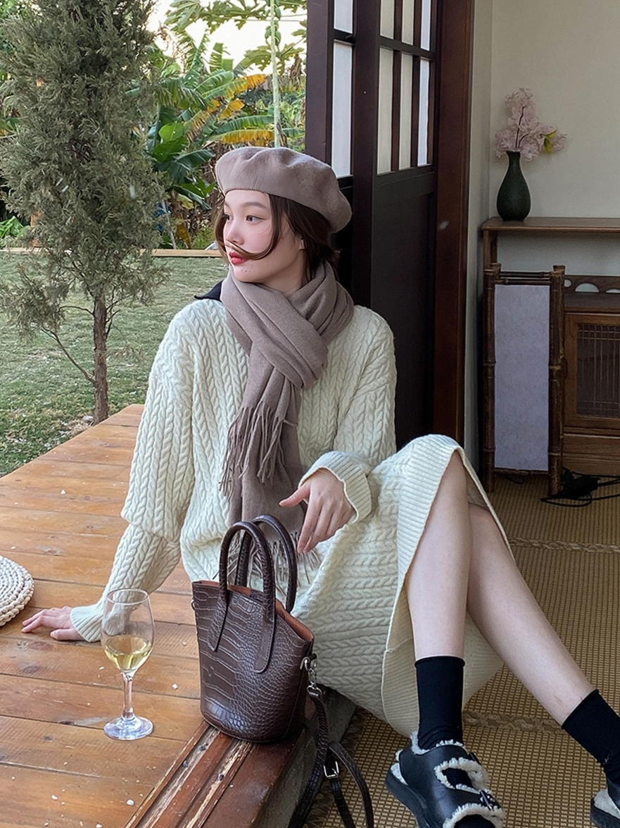 说完版型和领口,就再来说说花纹,我猜不少姐妹都迷恋过粗针织裙,看起来慵懒、舒适,还有韩系小姐姐的feel。